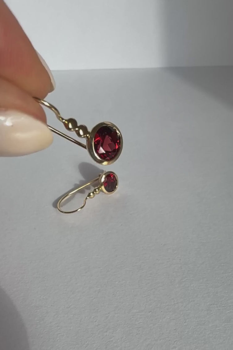 These hook earrings feature stunning round garnets in a bezel yellow gold setting. Perfect for adding a touch of elegance to any outfit.